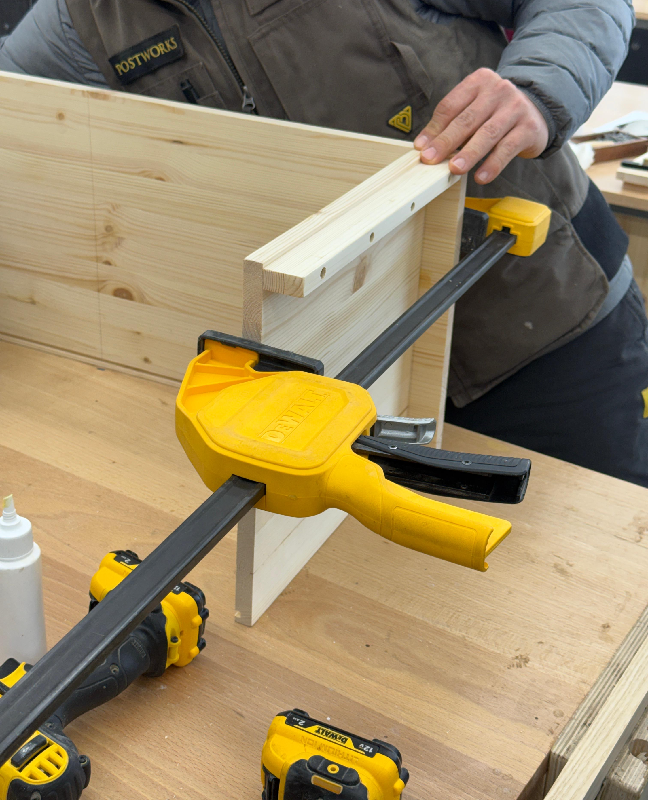 *클램프의 힘을 받는 중심 지점을 확인하여, 결합 시에 동등한 힘이 목재에 가해져서 일부분이 뜨지않도록 주의한다.