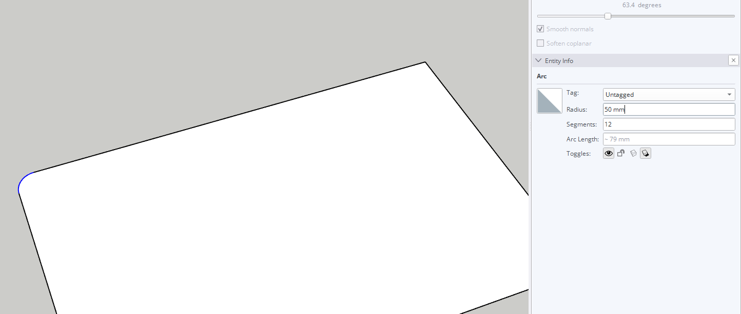 가이드라인을 사용하지 않더라도, Arc로 임의의 fillet을 실시한 후 Entity info 창에서 radius값을 수정할 수 있다.