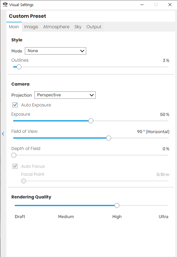 작업시에는 High로 가능하나, 사양이 지나치게 낮은 경우 Draft로 해도 가능, 마지막 뽑을땐 Ultra로 놓고 뽑는다.